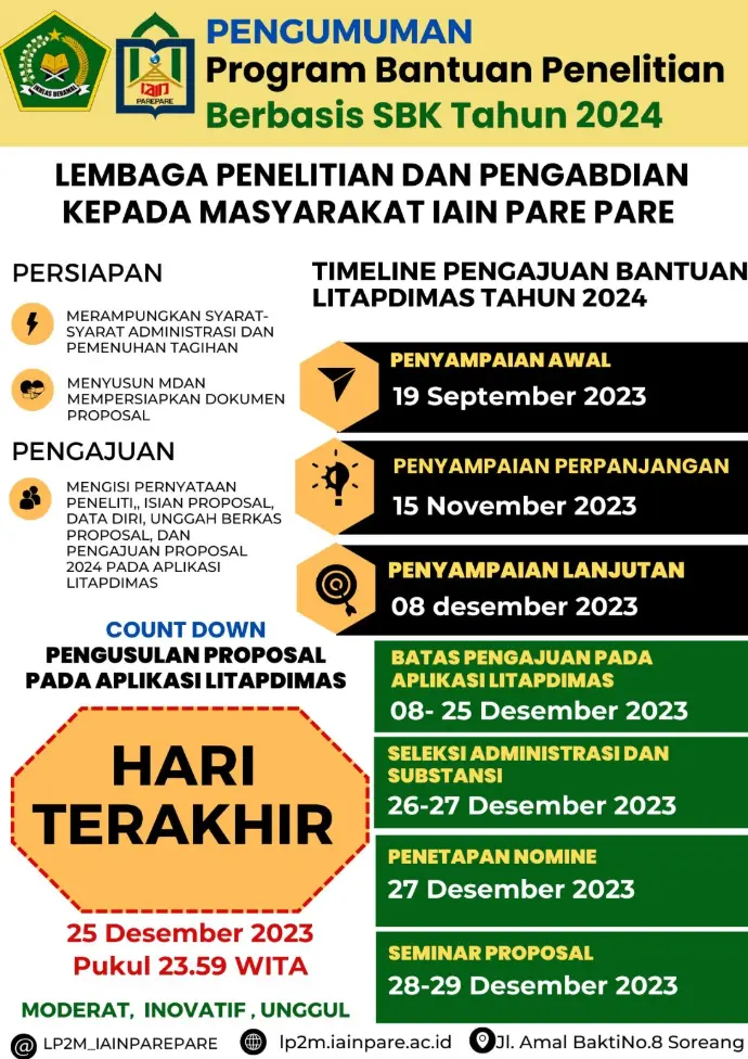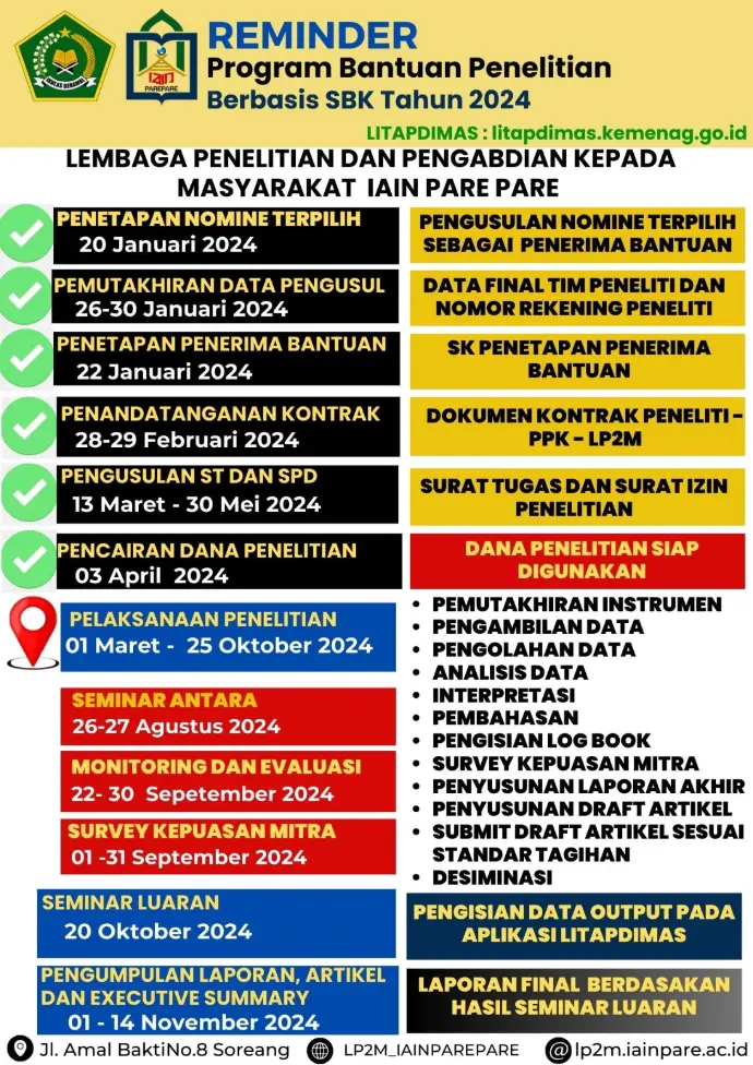 IAIN Parepare melalui Lembaga Penelitian dan Pengabdian kepada Masyarakat (LP2M) menyelenggarakan Sosialisasi Program Bantuan Penelitian Berbasis SBK Tahun 2024 pada 18 Desember 2023 di Gedung LP2M IAIN Parepare. Kegiatan ini digelar sebagai tindak lanjut dari diterbitkannya Petunjuk Teknis (Juknis) Program Bantuan Penelitian Tahun 2024 oleh Kementerian Agama RI.