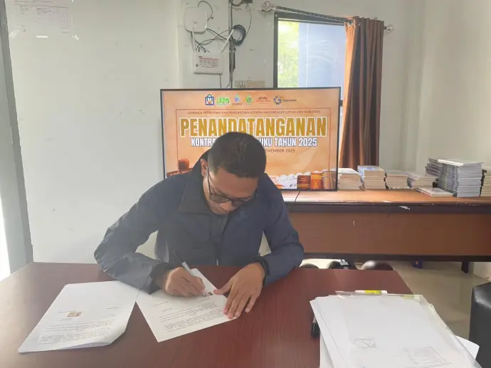 Humas IAIN Parepare — Lembaga Penelitian dan Pengabdian kepada Masyarakat (LP2M) IAIN Parepare kembali menegaskan komitmennya dalam mendorong produktivitas akademik dosen melalui Program Hibah Buku Tahun 2025. Sebanyak 32 dosen penerima hibah resmi menandatangani kontrak hibah buku yang digelar di Aula LP2M, Kamis (13-11-2025).